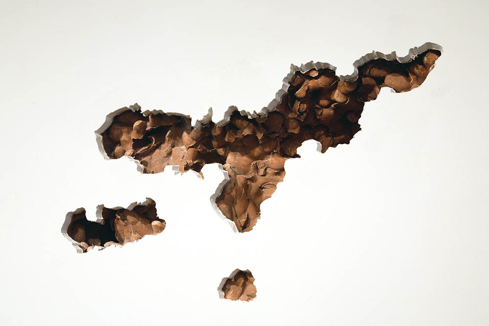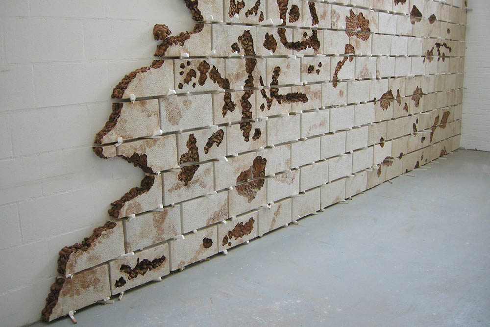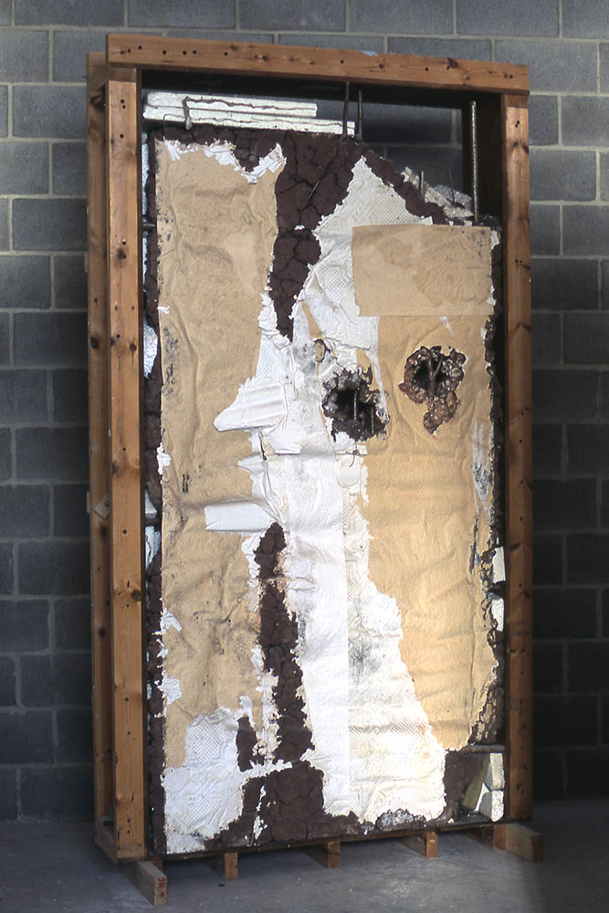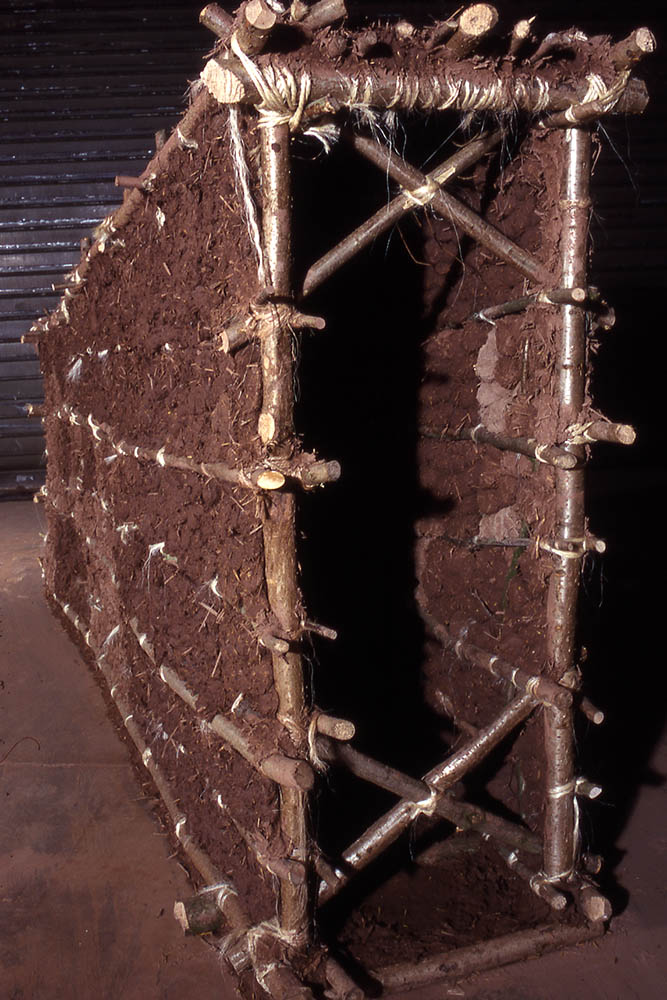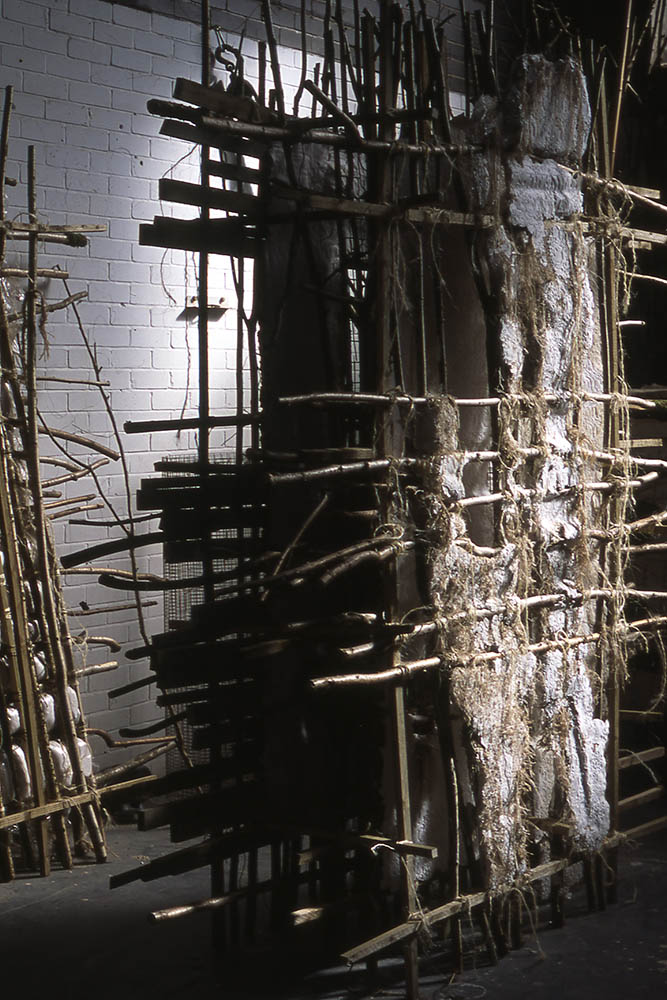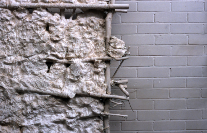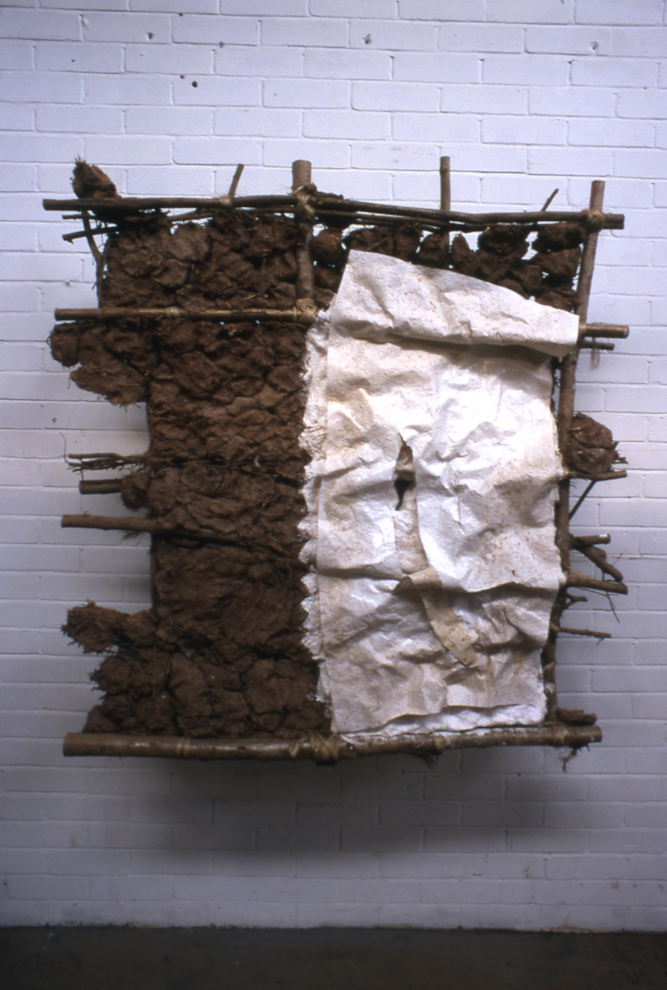 This piece was the physical construction of an invisible space between the brick wall of my studio and the clay and stick relief (Panel V) in front of it.